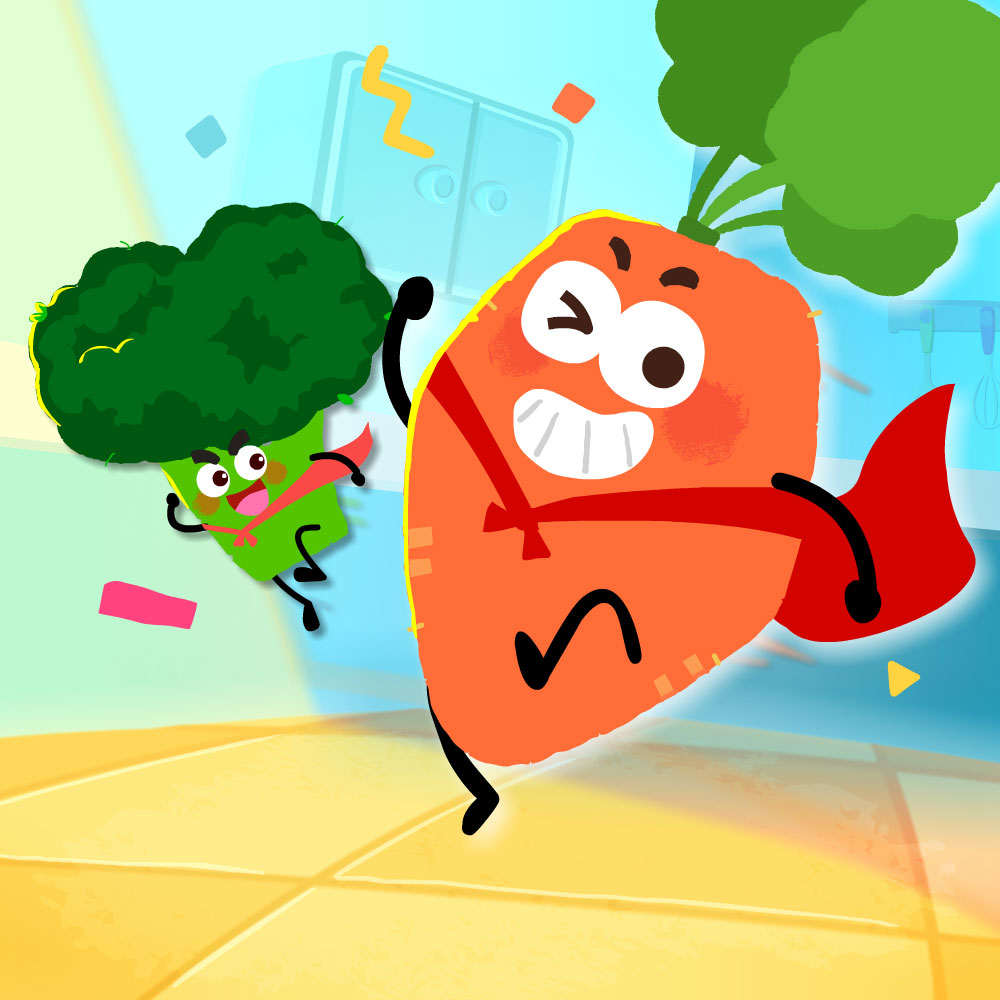 キッチンの野菜たちは、ケンタくんに虹色のお料理を作ってあげようと思っています。