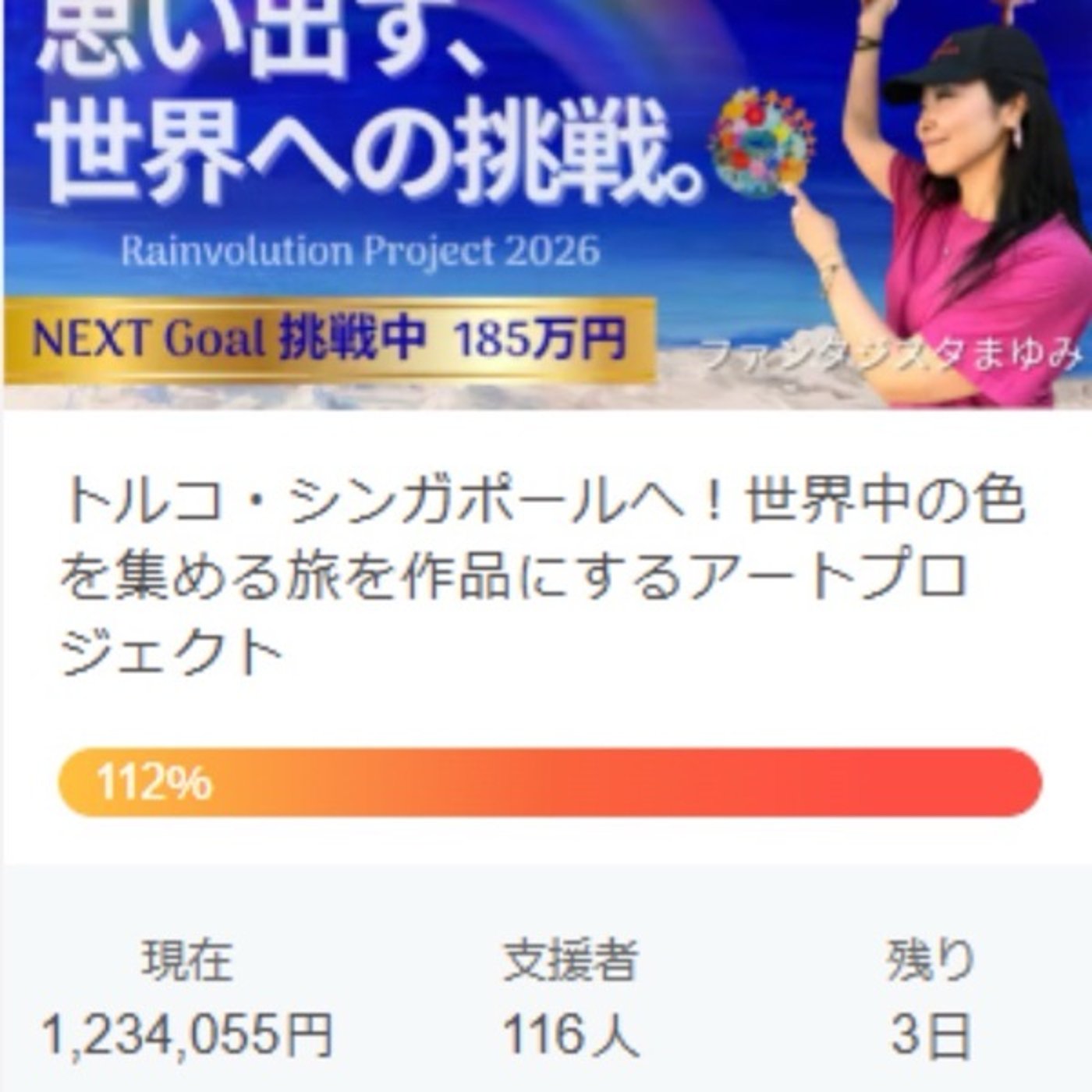 まゆみさんの最終ゴールはその先にあって、このクラファーの最終ゴールはその先にあって、225万円なので目標は204%まで持っていきたいというところですね。