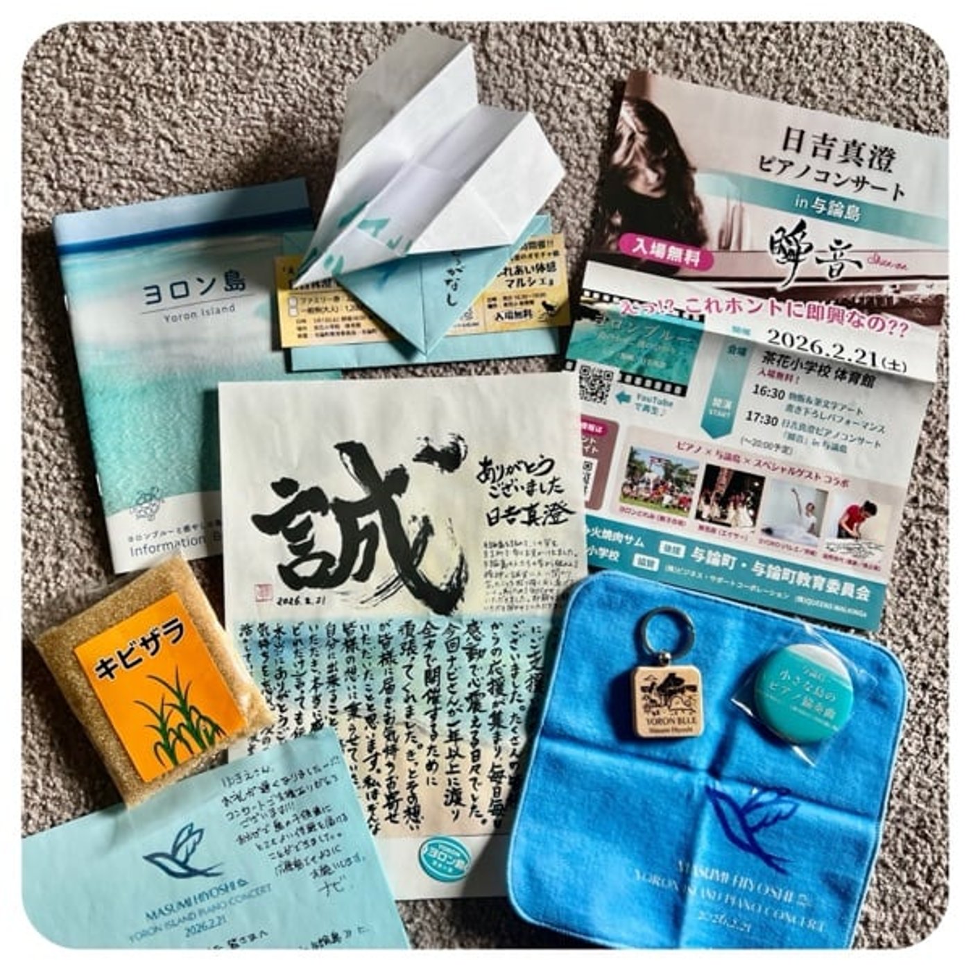 あの中にね、サトウキビのサトウとか、あとはかわいいタオルだったりとか、あとはひよしますみさんの関する情報のパンフレットとか、