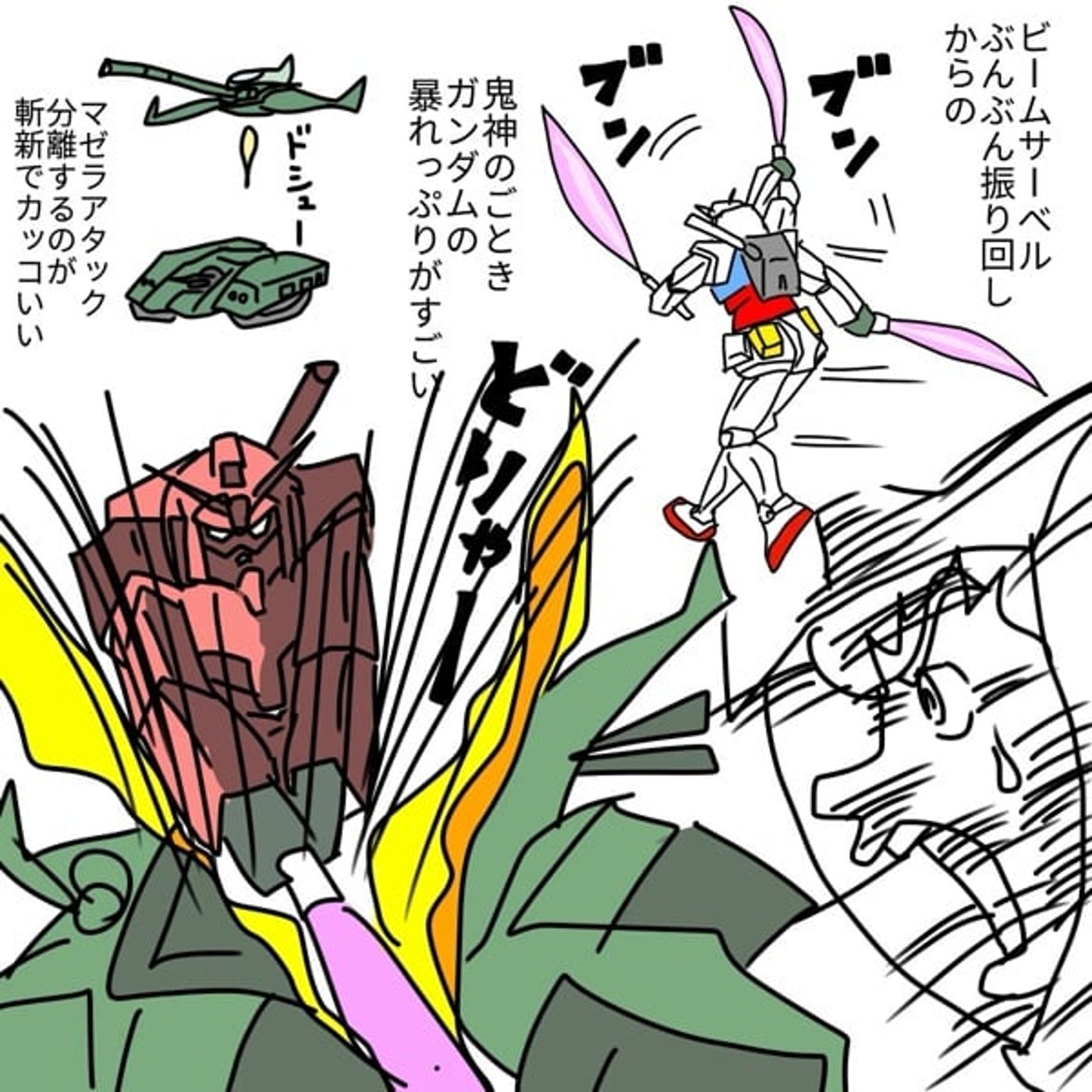 だって、絵も下手だから、なんかフニャフニャのザクみたいなやつが、ふよふよしてて、ただ斬られるだけみたいな。