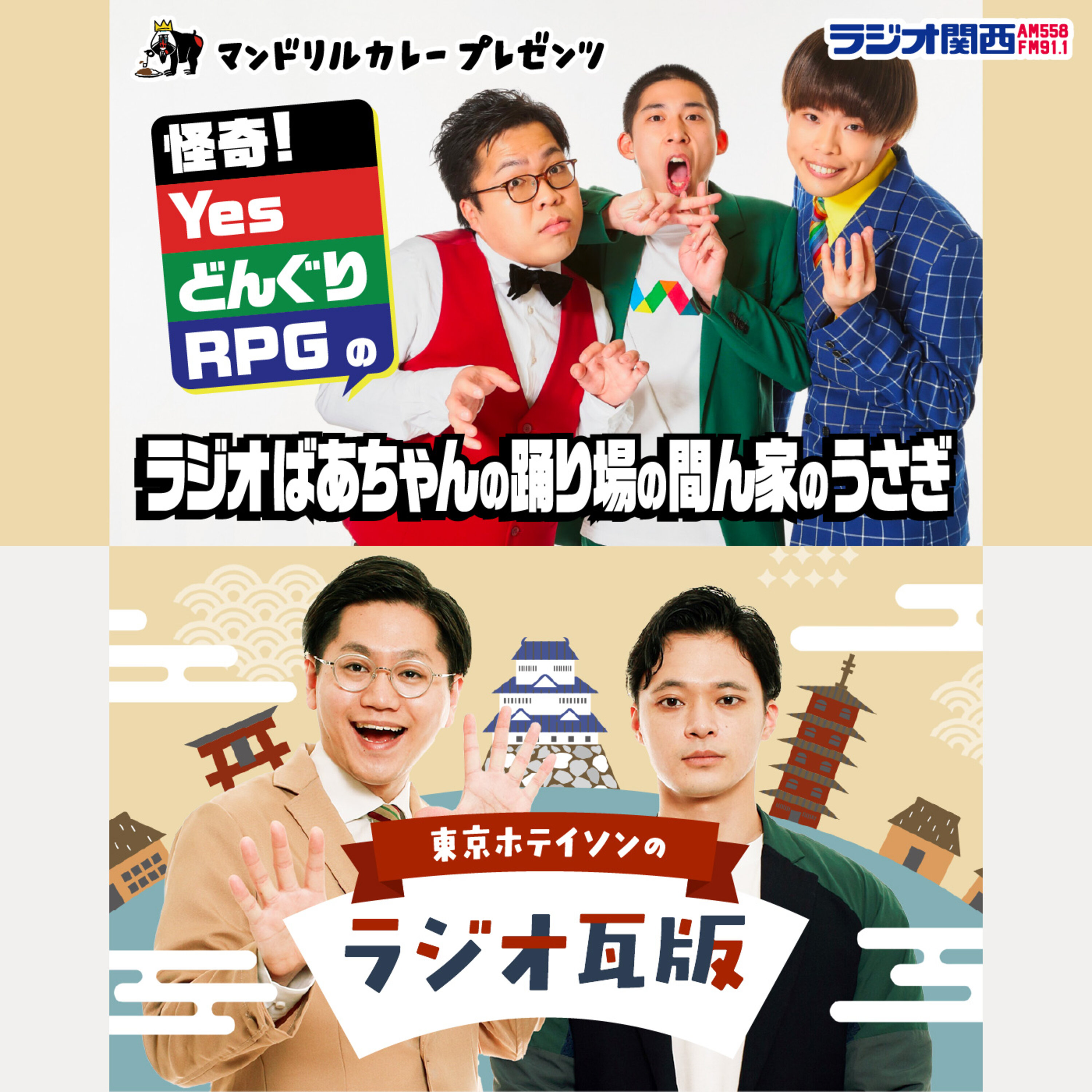 ★前編は『マンドリルカレーpresents怪奇!YesどんぐりRPGのラジオばあちゃんの踊り場の間ん家のうさぎ』Podcastで!https://jocr.jp/audio/★特番アフタートーク動画は、東京ホテイソン公式アプリ「東京ホテイ村」で!https://tokyohoteison.ordinary.app/--------------------------------------------ラジオ関西で毎週金曜日に放送中、『怪奇ラジオ』と『ラジオ瓦版』のコラボ特番が実現! 東京ホテイソンが近日中に開催する「全日本おっぱい祭り」。この機会にと、怪奇!YesどんぐりRPGにデモンストレーションをお願いするも、思う通りにはいかず…--------------------------------------------◆特別番組『マンドリルカレーpresents怪奇!YesどんぐりRPGと東京ホテイソンのラジオばあちゃんの踊り場の間ん家のうさぎのラジオ瓦版』ラジオ関西放送日時 2022年3月11日(金) ~(Podcastでのディレクターズカット版のアーカイブ配信あり)<パーソナリティー>怪奇!YesどんぐりRPG(Yes!アキト、どんぐりたけし、サツマカワRPG)東京ホテイソン(たける、ショーゴ)--------------------------------------------
